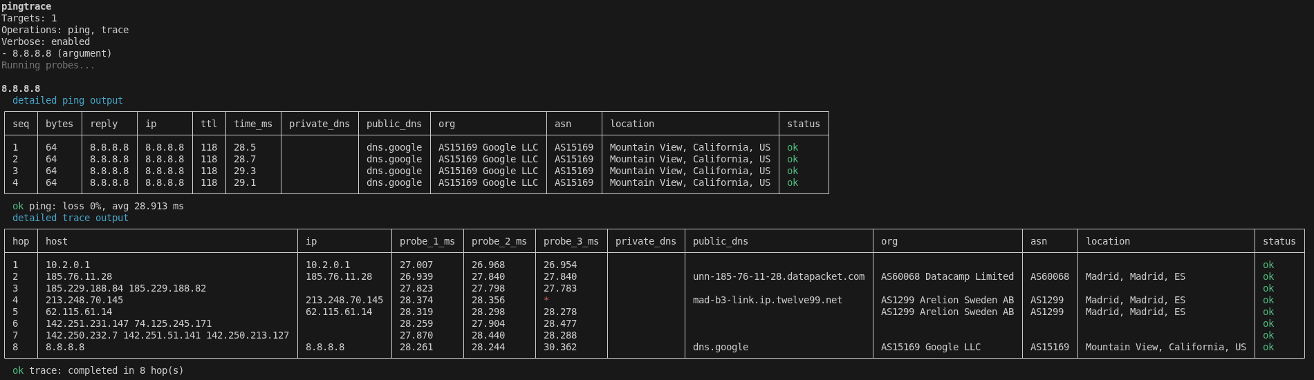 Verbose output renders ping first and trace second, with separate tables for a clearer view.